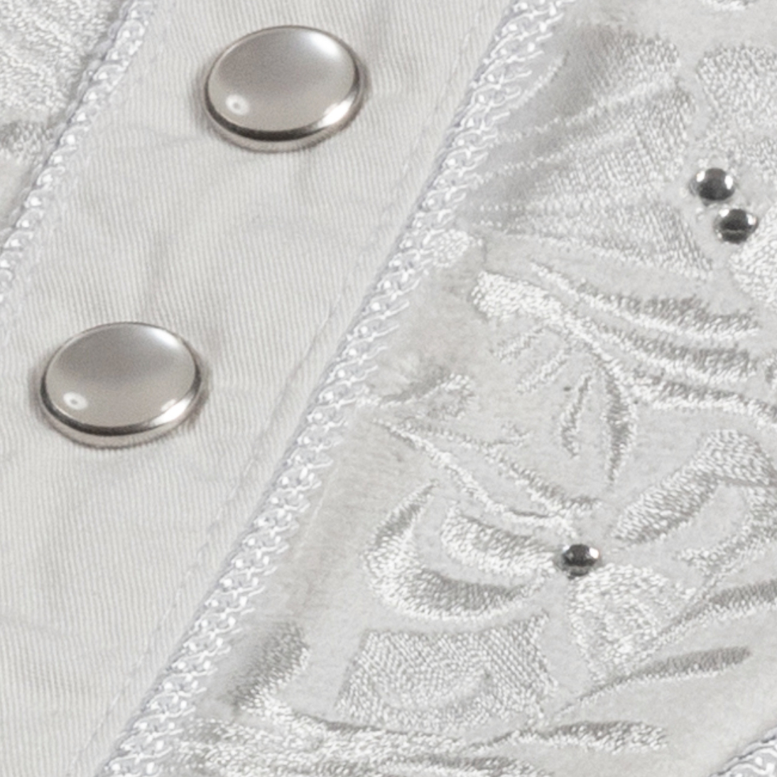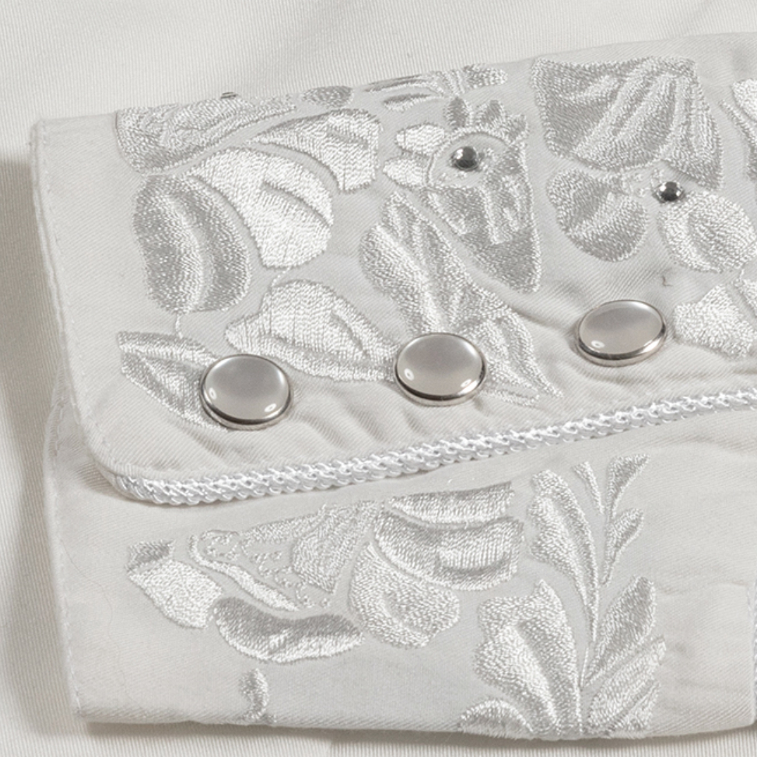 Confeccionada en un impecable blanco puro, su magia reside en el detallado bordado en los canesúes (hombros) y los puños, un diseño que evoca la artesanía tradicional de las camisas vaqueras. Los sutiles apliques florales y el pespunte a contraste a lo largo de las costuras definen una silueta femenina y favorecedora.
