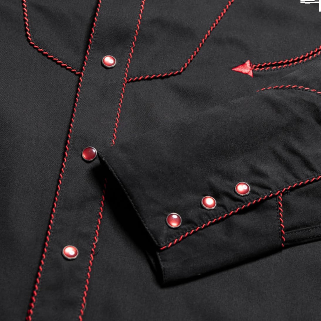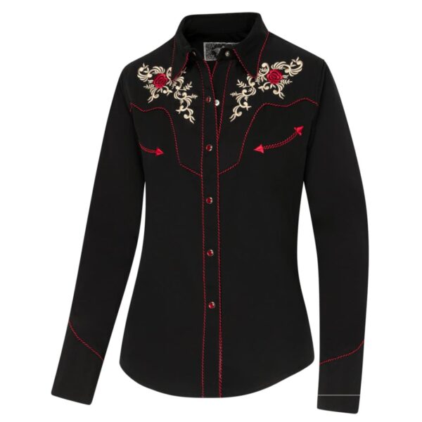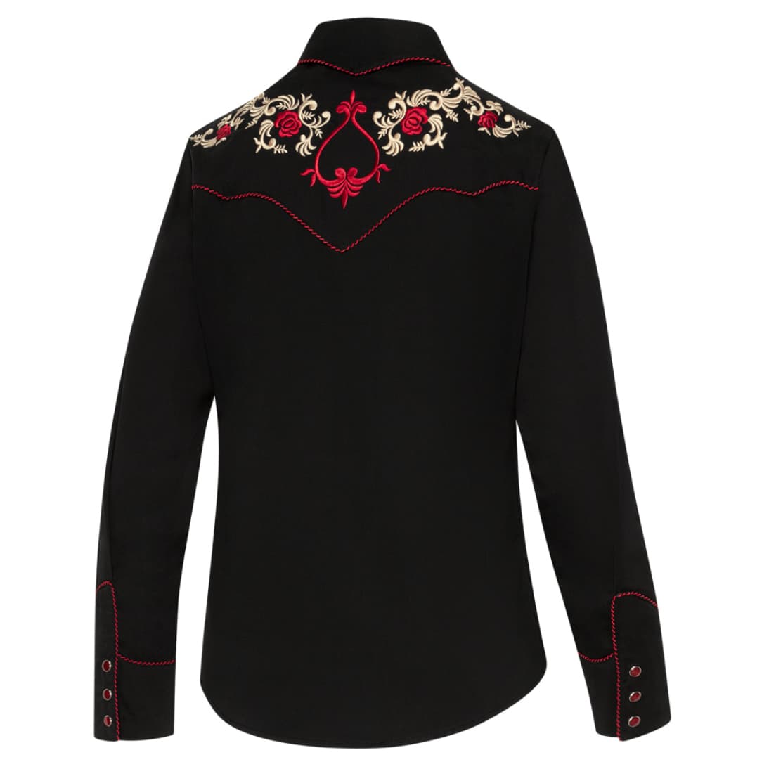 Imagina el misterio de una noche cerrada iluminado por el vibrante carmín de las rosas, una prenda que captura la elegancia más sofisticada de la moda cowgirl clásica.