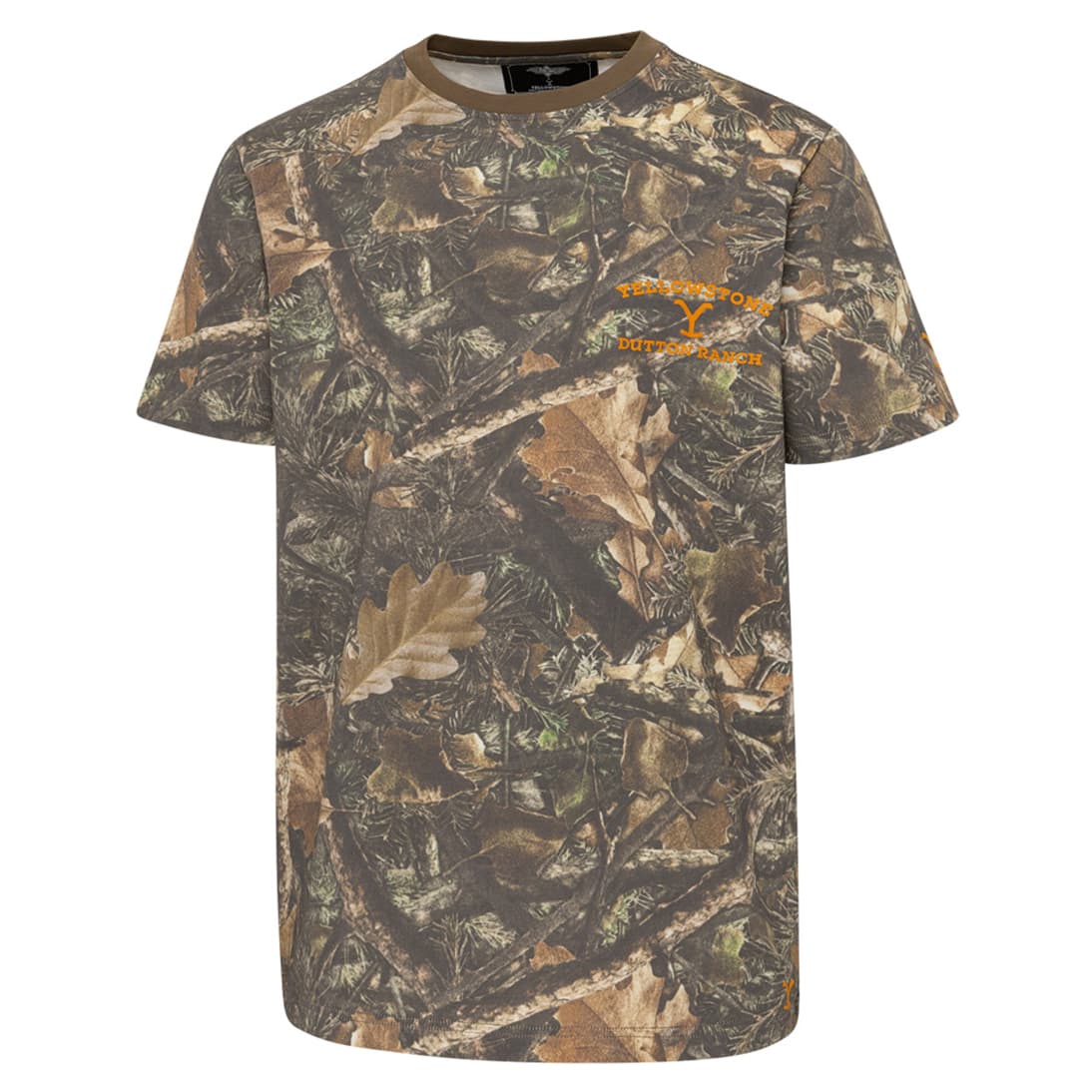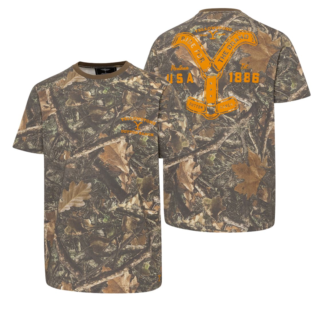 Camiseta Ride for the Brand Camo Yellowstone unisex con cuello redondo confeccionada en algodón de alta calidad. Refinada con un sutil print del logo de Yellowstone en el pecho y la manga, y un impactante print premium en la espalda.