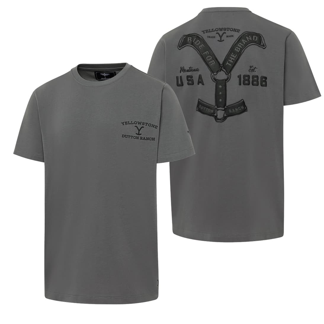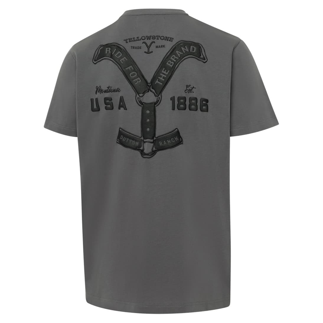 Camiseta Ride for the Brand grey Yellowstone unisex con cuello redondo confeccionada en algodón de alta calidad. Refinada con un sutil print del logo de Yellowstone en el pecho y la manga, y un impactante print premium en la espalda.