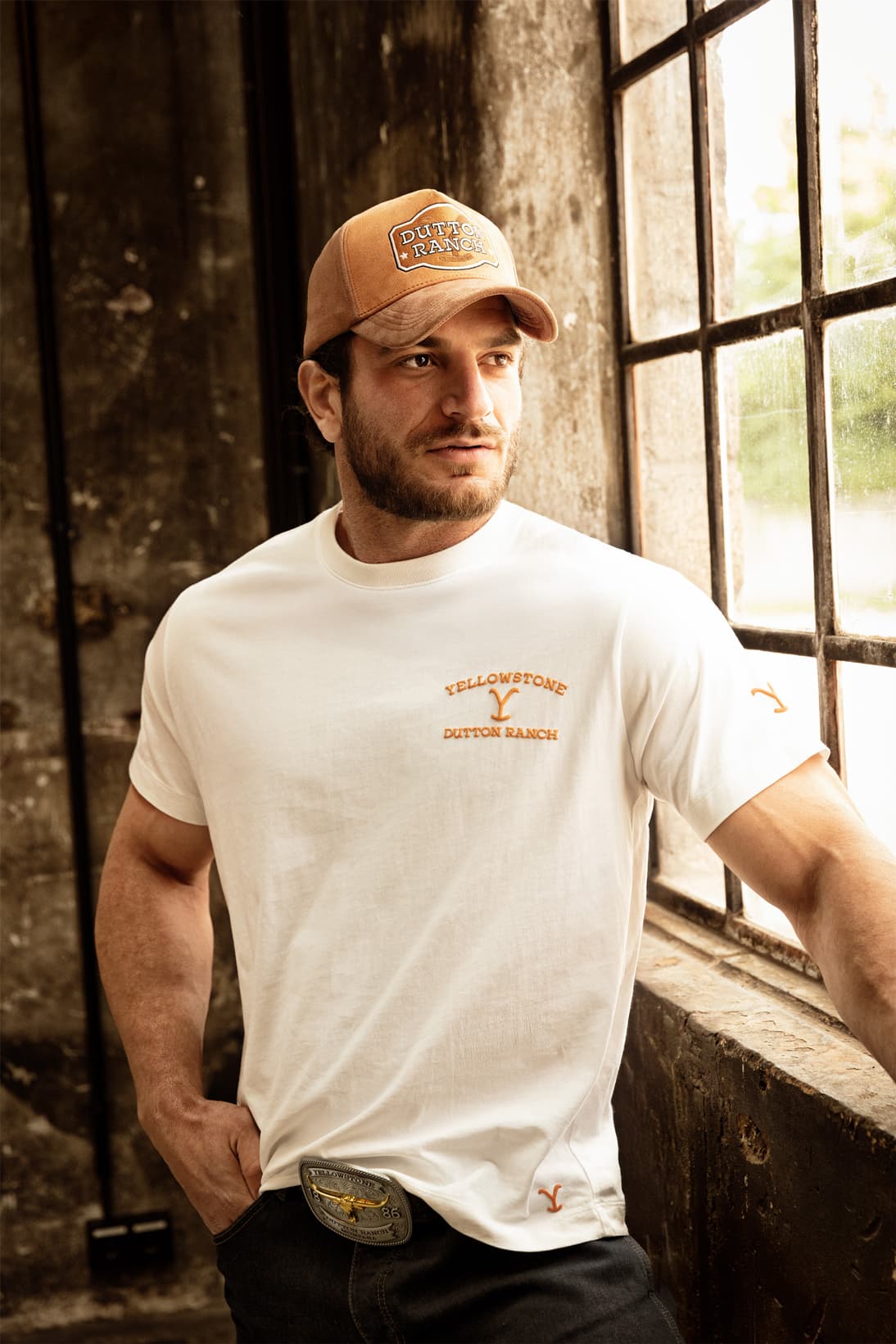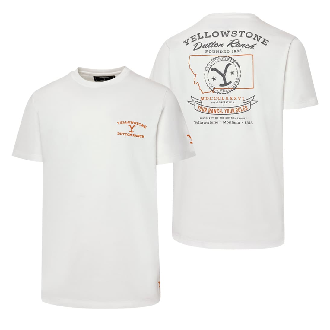 Presenta un diseño sutil con el logo de Yellowstone en la manga y un llamativo print premium en el pecho con la frase “Your Ranch Your Rules”.
