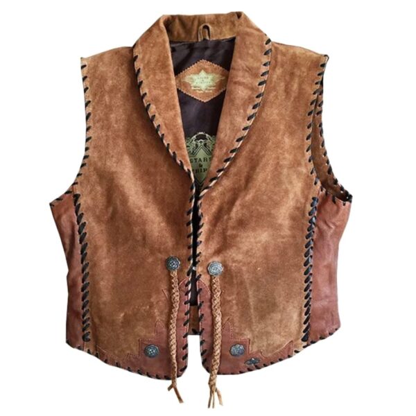 En las piezas de cuero lleva varios conchos plateados, siendo en la parte delantera central donde cuelgan dos trenzas de esos conchos a modo de adorno más vaquero si cabe. Entre estos dos conchos hay oculto un corchete para que puedas ceñirlo a tu figura, si por el contrario llevas el chaleco abierto, este corchete no afeará para nada el conjunto, pues se queda oculto al ser tan pequeño.