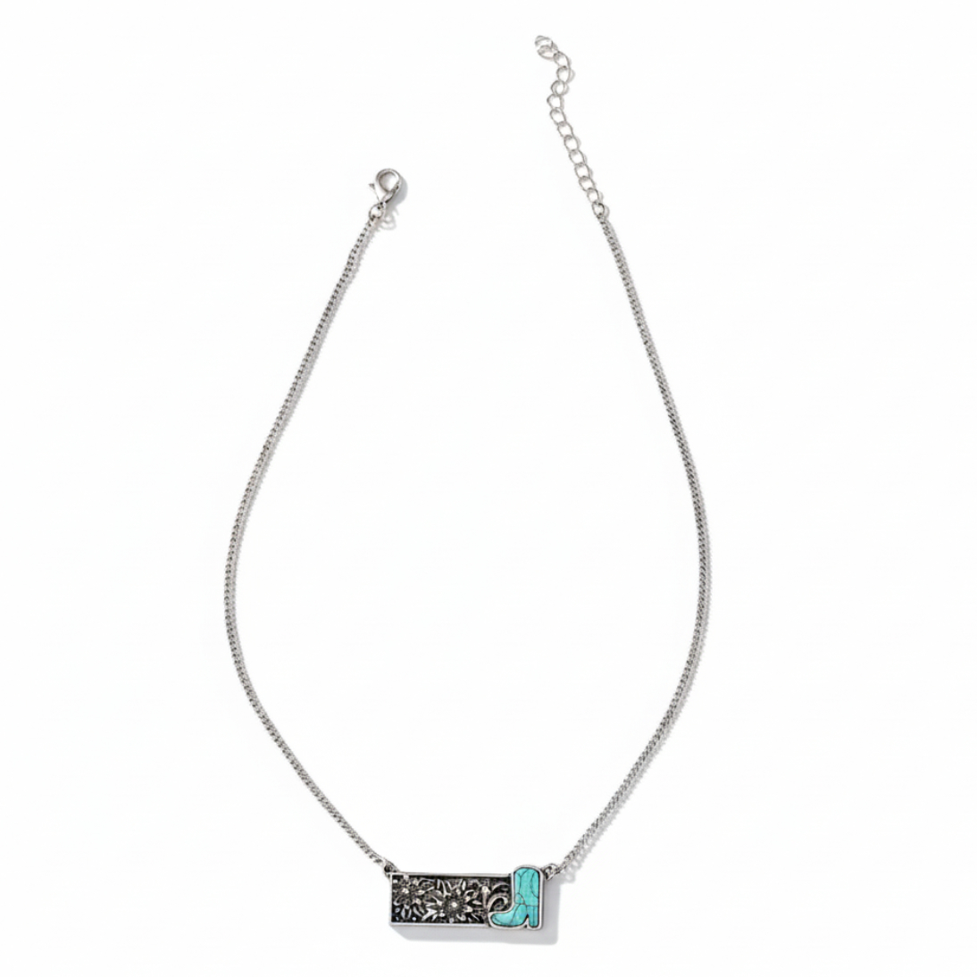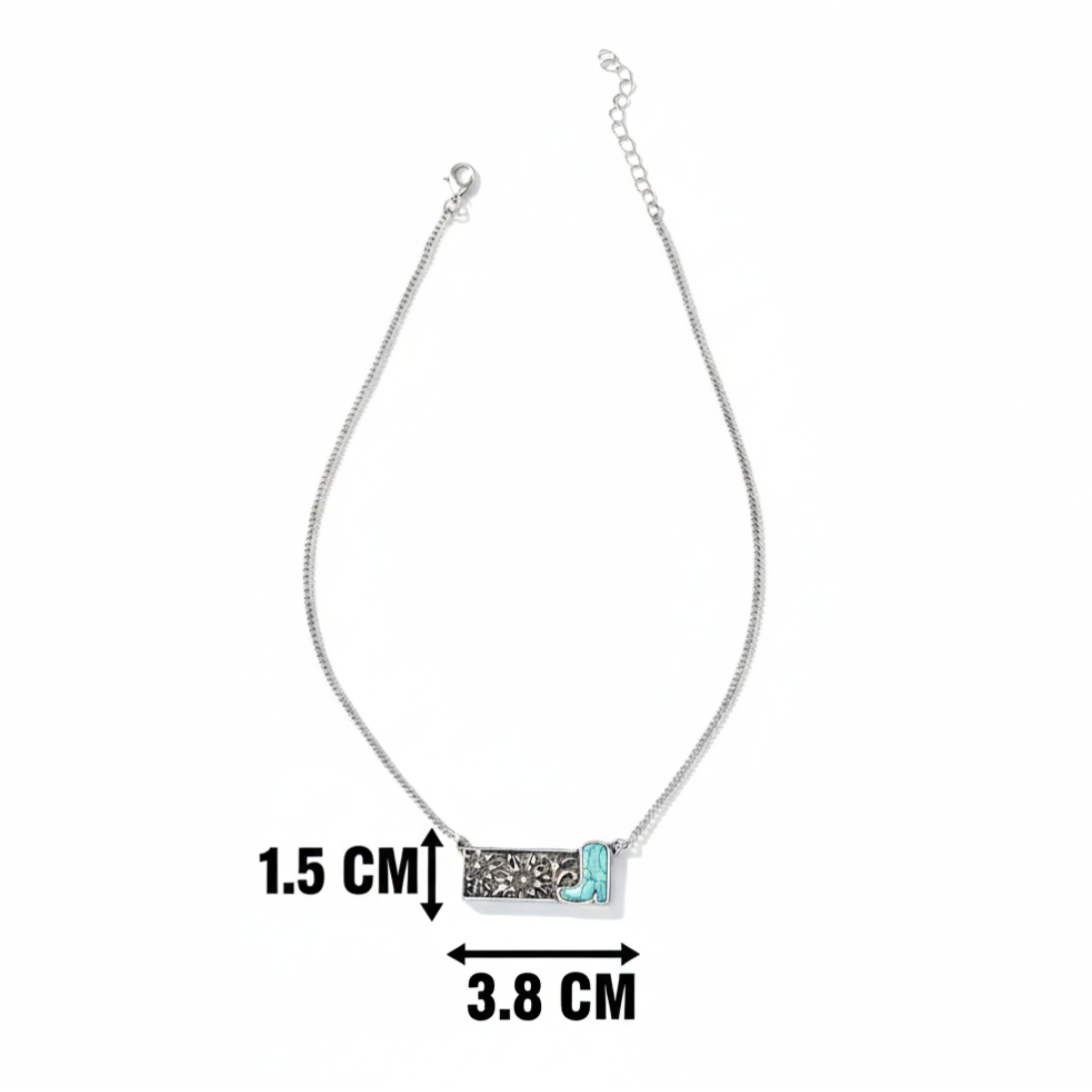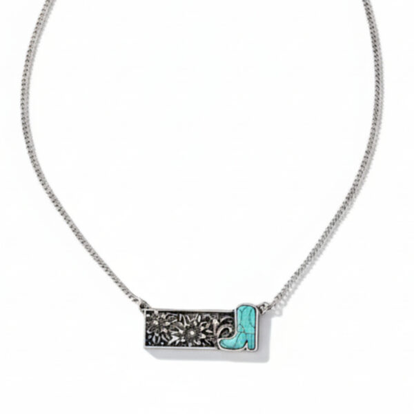 Adorno: Placa rectangular que combina un delicado patrón de filigrana con una distintiva bota vaquera en color turquesa.
