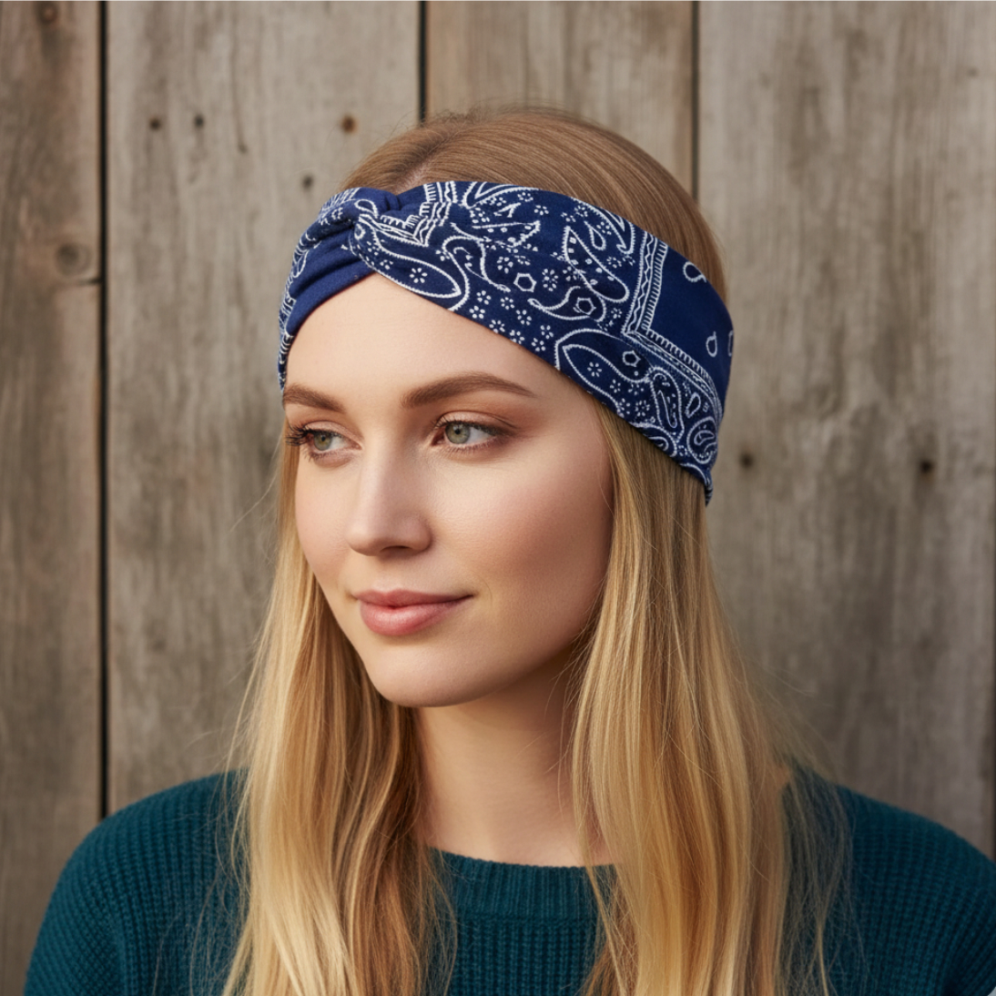 La Diadema Bandana Azul Índigo es el básico indispensable que conecta tu outfit diario con el espíritu libre e inquebrantable del Oeste americano.