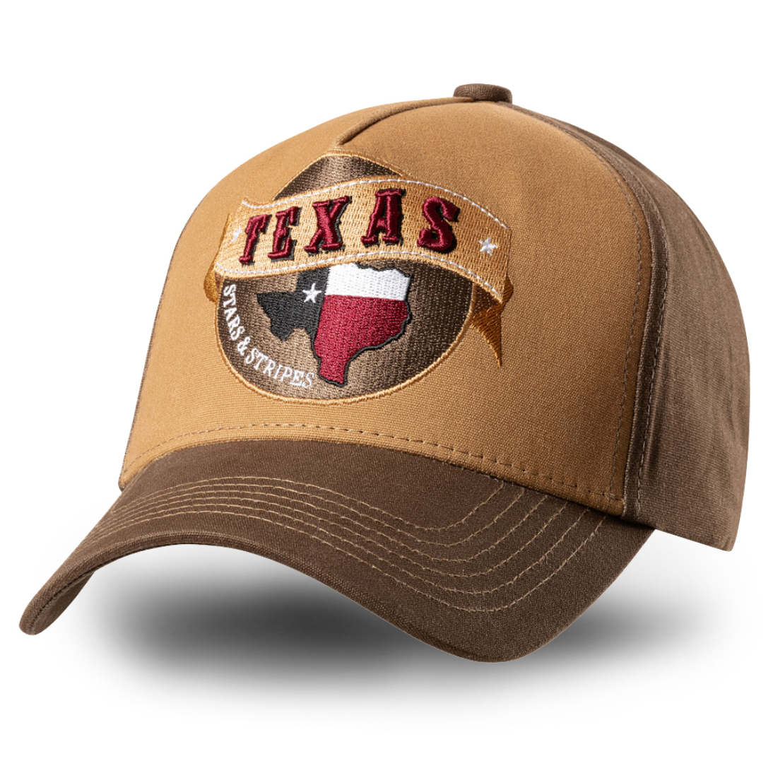 El centro de todas las miradas es el elaborado bordado frontal que celebra el estado: el nombre “TEXAS” destaca sobre el mapa y los colores de la bandera. Es un trabajo artesanal que convierte a esta gorra de ala curva en una auténtica pieza de colección.
