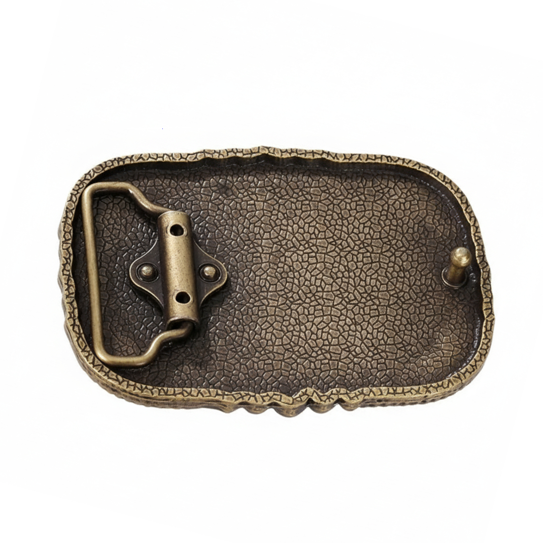 El acabado en bronce antiguo resalta la riqueza del grabado, otorgándole el aire de una reliquia atesorada. Los bordes están enmarcados por un fino cordón trenzado y un patrón de cuentas, añadiendo una textura rústica y auténtica. Con unas medidas de 9,5 cm de ancho y 6,5 cm de alto, es una hebilla con una presencia notable y un profundo significado.