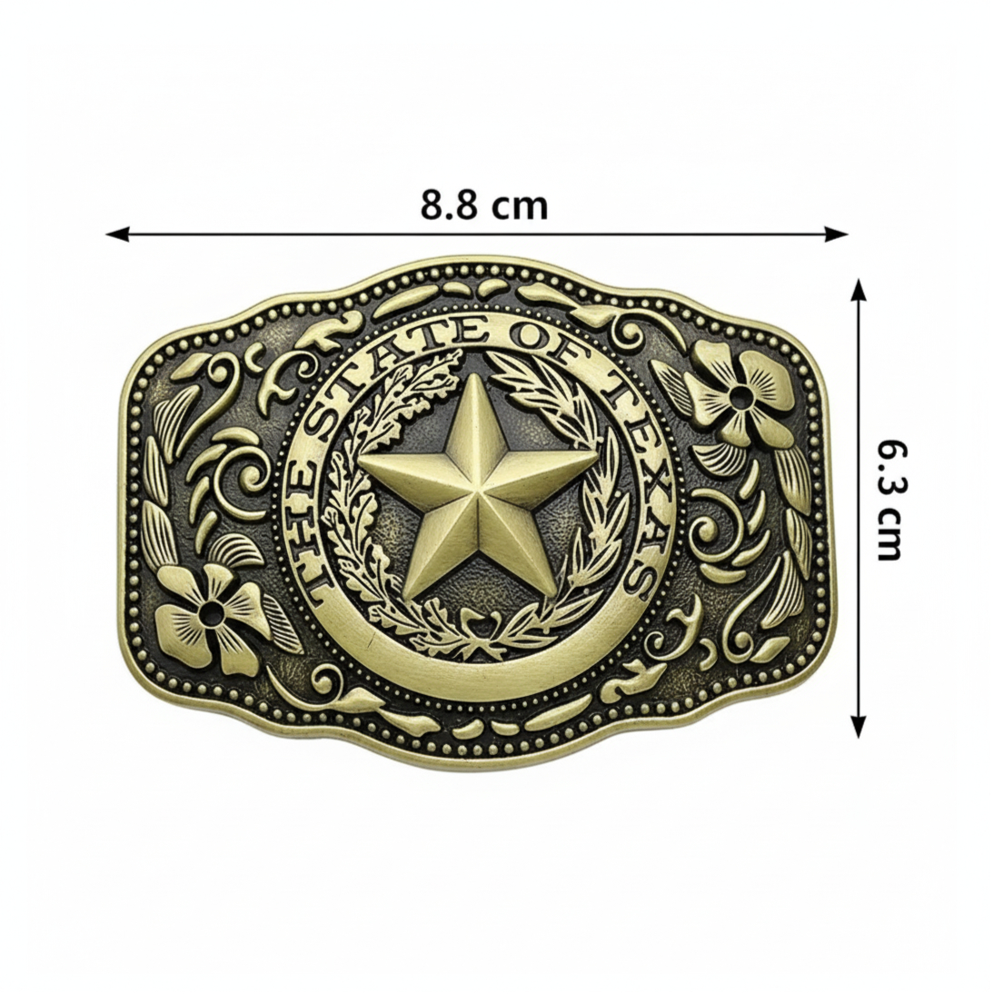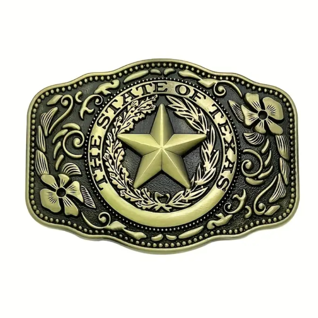 En el corazón de la hebilla, la inconfundible Estrella Solitaria irradia fuerza, rodeada por el nombre The State of Texas, un símbolo de independencia y grandeza. El diseño se realza con un exquisito trabajo de filigrana floral en los bordes, que añade un toque de encanto y calidez campestre.
