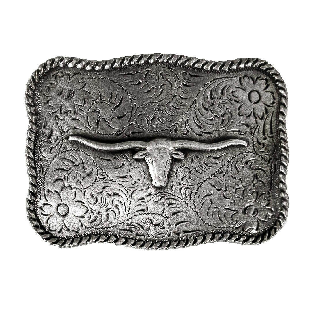 En el centro de la hebilla, una cabeza de Longhorn meticulosamente detallada con sus largos y majestuosos cuernos se alza con orgullo. Este potente emblema está enmarcado por un exquisito trabajo de filigrana floral que parece florecer sobre el fondo texturizado, añadiendo un contraste de delicadeza a la robustez del toro.