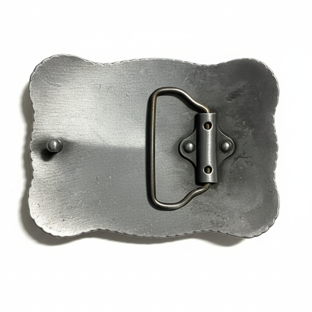 El acabado en plata antigua le confiere un aire de autenticidad y atemporalidad, como si hubiese sido pulida por el tiempo en las manos de generaciones de vaqueros. Los bordes están adornados con un patrón de cuerda trenzada, evocando los lazos y el trabajo manual del campo.