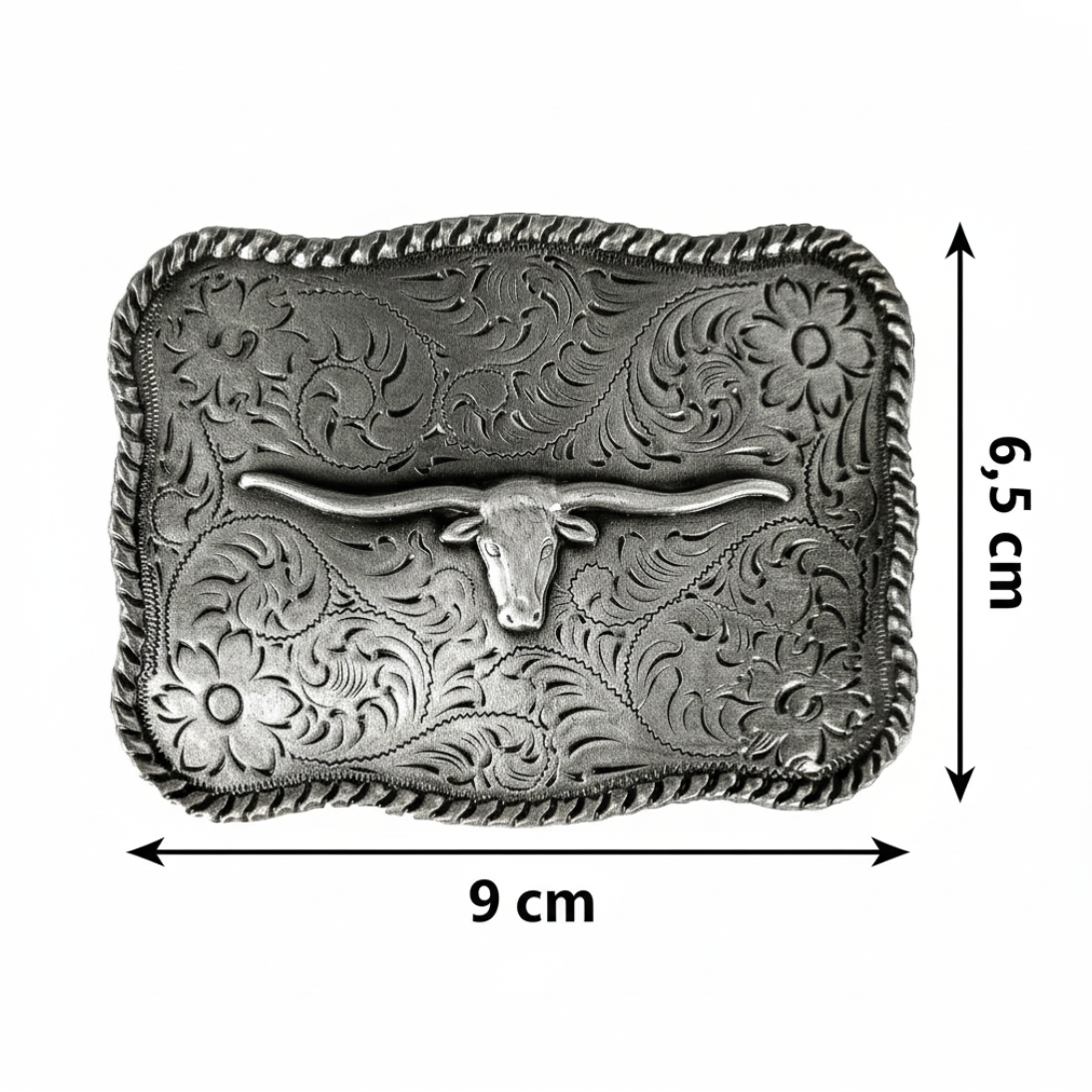 Con unas medidas de 9 cm de ancho y 6 cm de alto, la Hebilla Toro es una declaración audaz de tu conexión con la tierra y las tradiciones más profundas del Lejano Oeste.