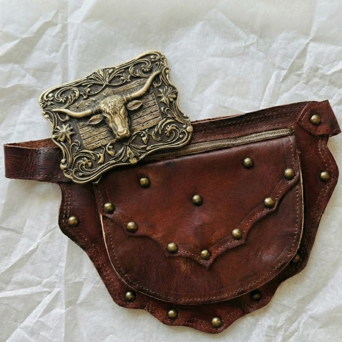 La riñonera de cuero en tono tabaco destaca por su diseño festoneado y remaches metálicos que le confieren un aire robusto y aventurero. Es la compañera ideal para festivales, paseos a caballo o simplemente para llevar lo esencial con las manos libres, sin renunciar a una estética impecable.