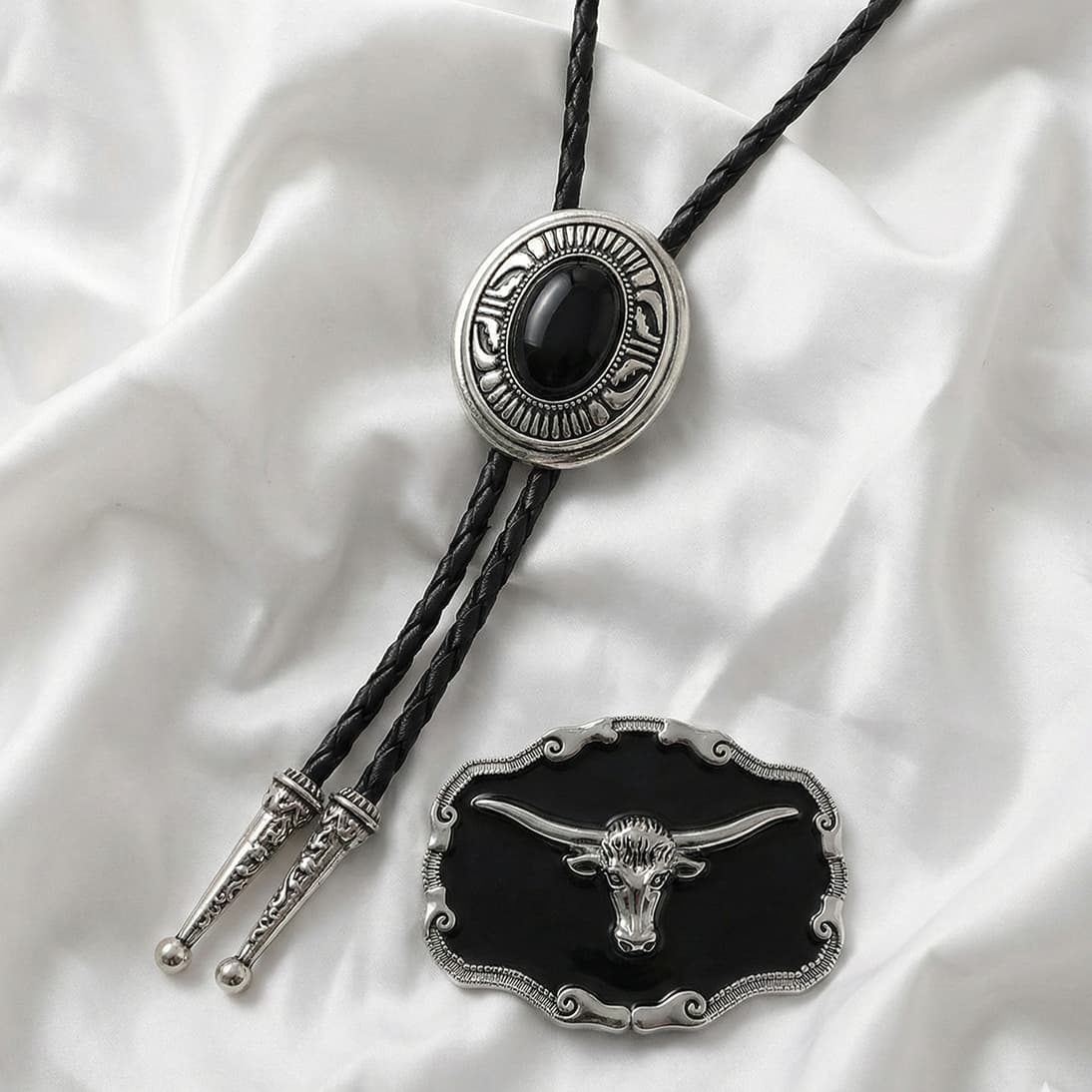 El Bolo Tie se presenta como el latido central de este conjunto. Su piedra negra, profunda y pulida, simboliza la lealtad eterna, enmarcada en una montura plateada que evoca los amaneceres en la pradera. El cordón trenzado se desliza con suavidad, permitiendo que quien lo lleva lo ajuste a su medida, como un abrazo perfecto que nunca aprieta.