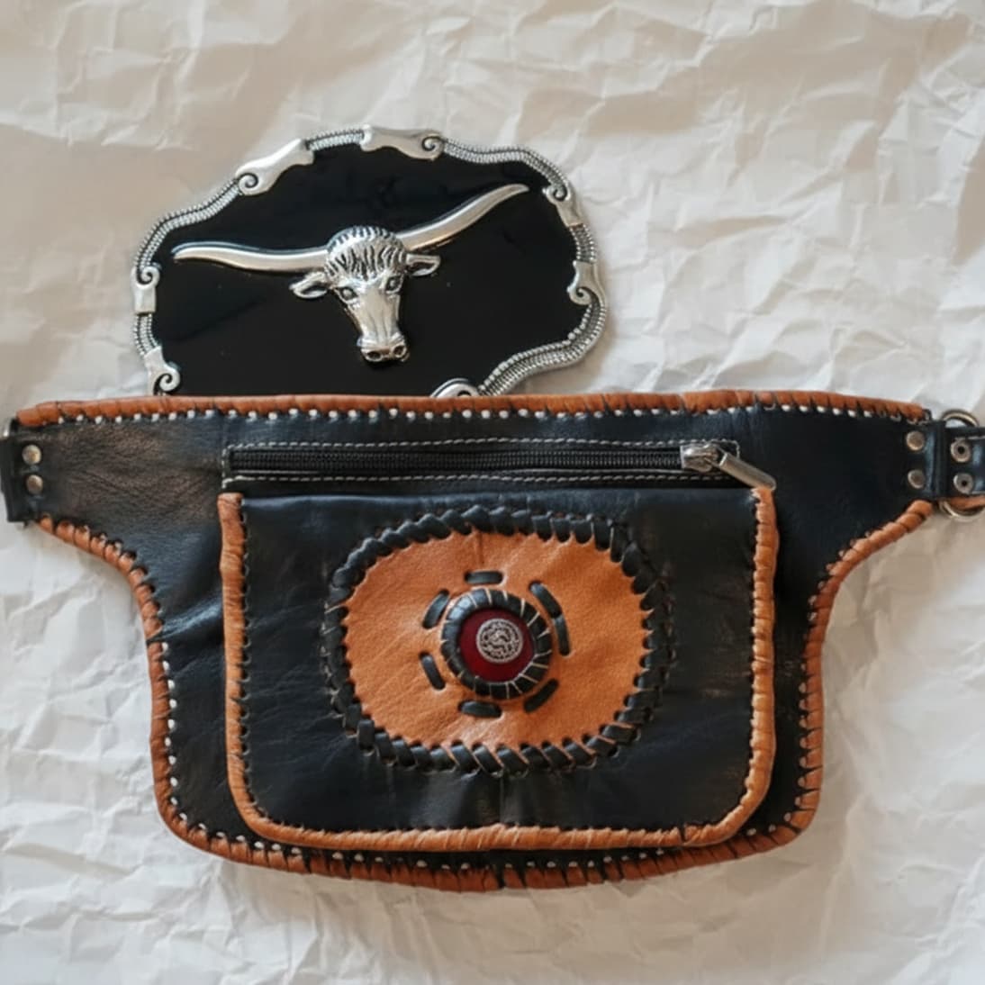 La pieza central de este conjunto es una riñonera de cuero genuino, trabajada con un diseño bitono en negro y canela que resalta su elaboración artesanal.