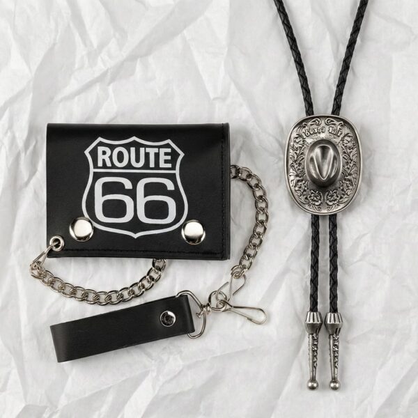 Billetera: Confeccionada en cuero negro con el escudo “Route 66”, cadena de seguridad metálica y cierre de botones a presión.