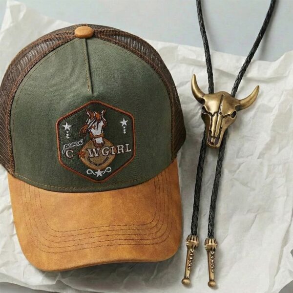 Gorra: Estilo trucker con frontal verde oliva, visera color mostaza y parche bordado “Cowgirl” con motivo ecuestre.
