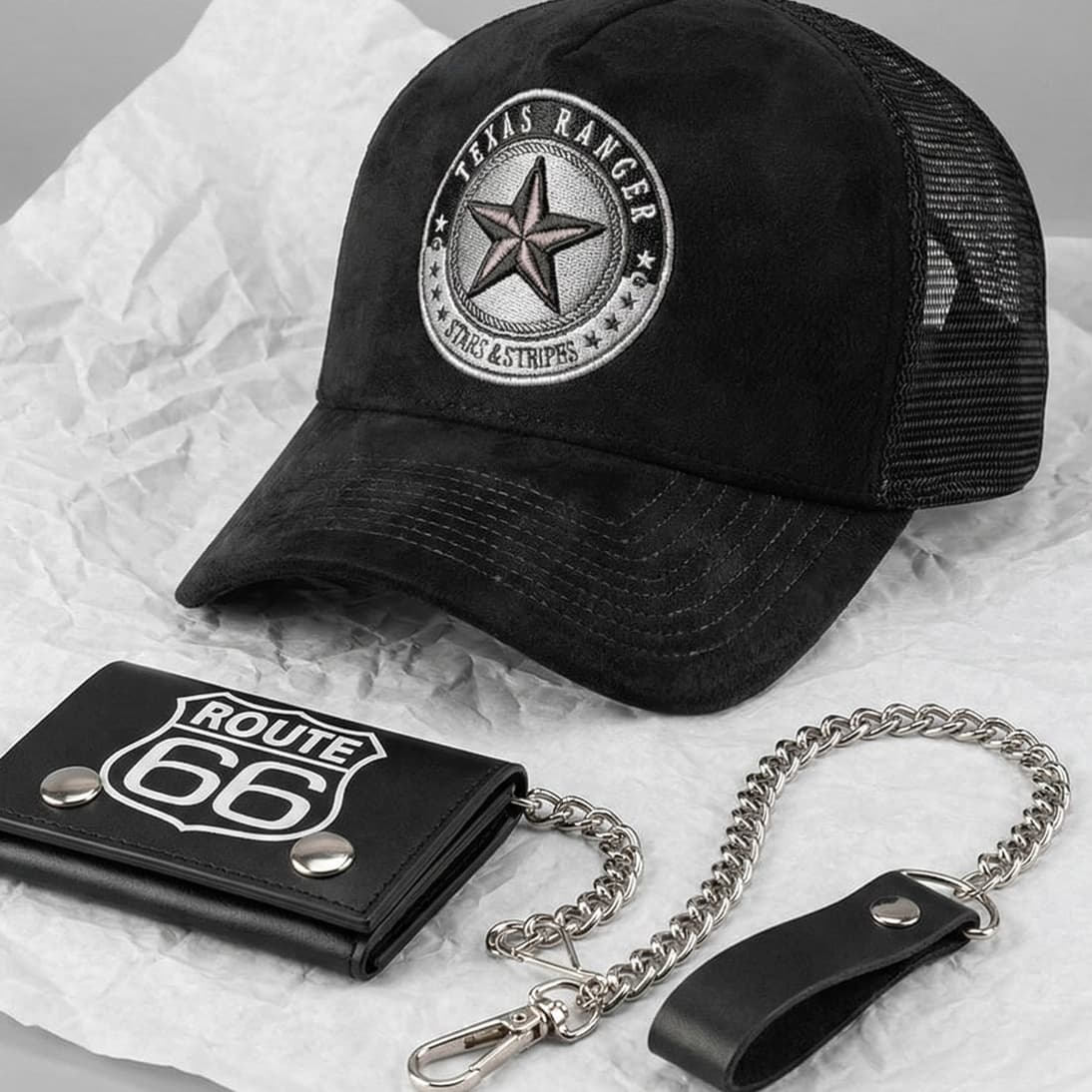 Para completar el conjunto, incluimos la billetera de cuero negro premium, orgullosamente grabada con el emblema de la Ruta 66.
