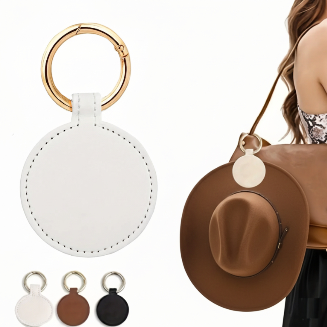 Fabricado con un cuero sintético suave y duradero, este ingenioso accesorio utiliza un potente sistema de imán para sujetar firmemente el ala de tu sombrero a la correa de tu bolso o mochila. Es ideal para esos momentos en que entras a un local, viajas en coche o simplemente quieres descansar sin preocuparte de dónde dejar tu cowboy hat. El robusto aro de metal dorado añade un toque de calidad y brillo vintage.