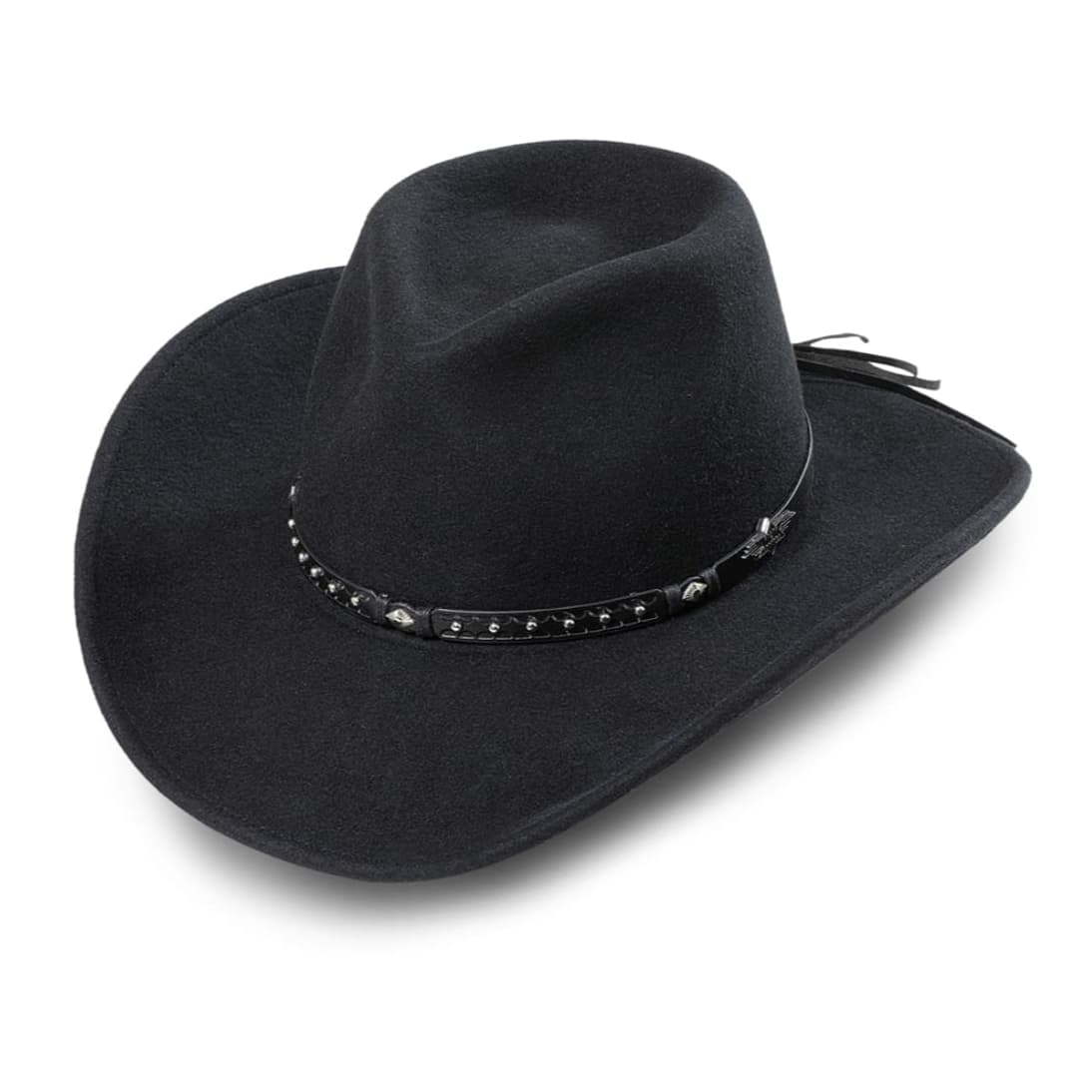 En el lateral, el sombrero presenta un distintivo concho metálico plateado con un diseño grabado de una estrella de cinco puntas flanqueada por alas estilizadas, aportando un carácter único y refinado. Los cordones de cuero negro que se extienden desde la parte trasera de la banda terminan en borlas decorativas que caen sutilmente sobre el ala curvada tradicional.